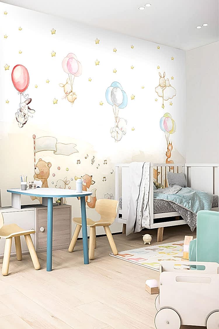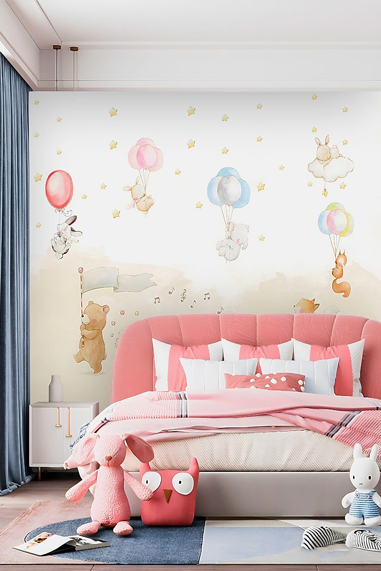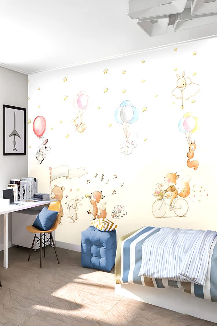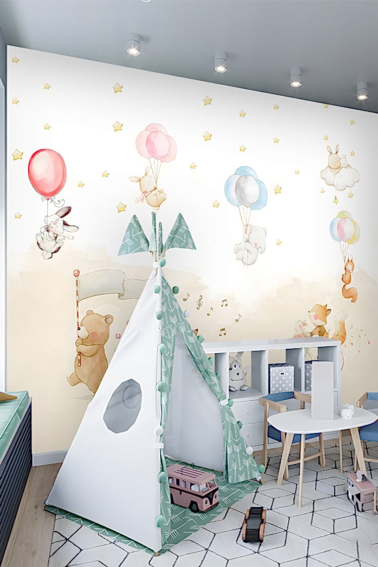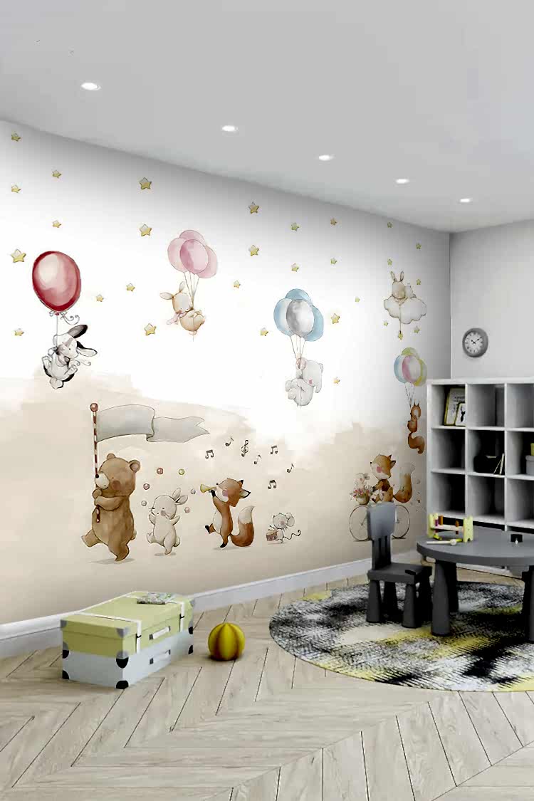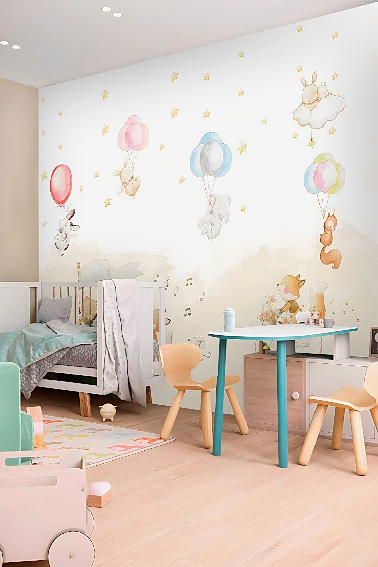 Balonlu Hayvan Figürlü Pastel Çocuk Odası Duvar Kağıdı