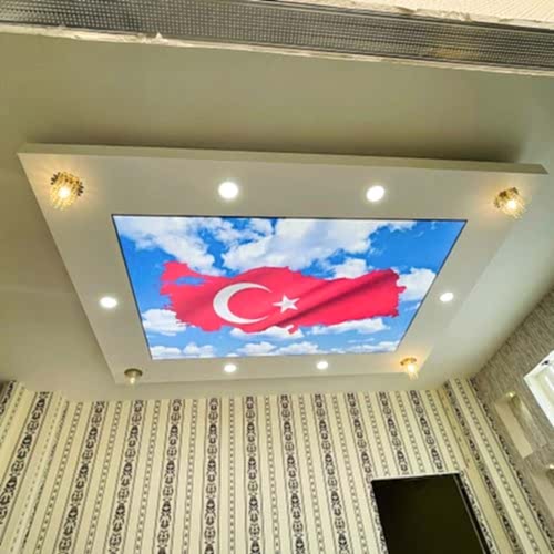 Bayrak desenli gergi tavanlar, mekanınıza estetik bir görünüm kazandırır. Farklı bayrak motifleri, renk kombinasyonları ve tasarımlar ile mekanınıza özgün bir hava katabilirsiniz. Bu tür dekorasyon, özellikle geniş alanlarda etkileyici bir görsellik sunar.