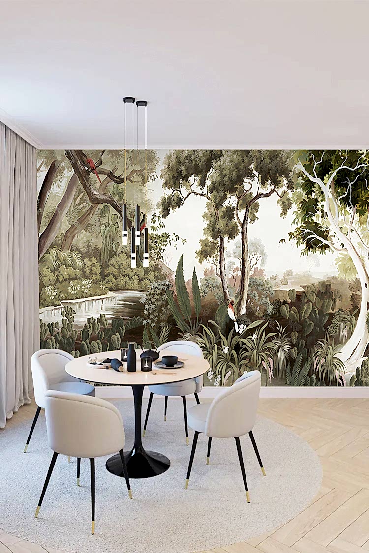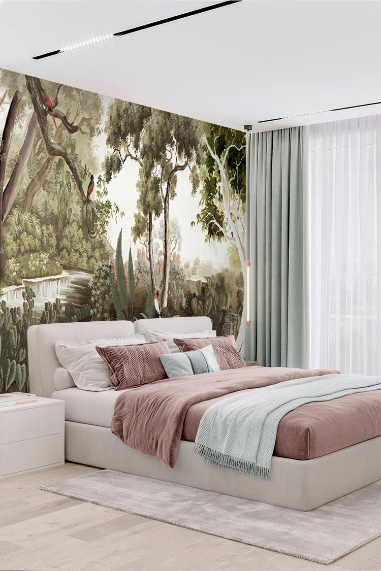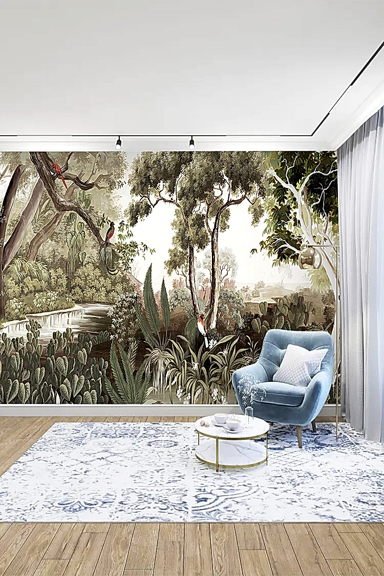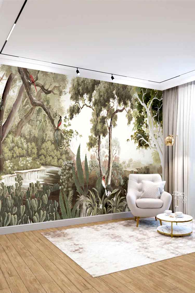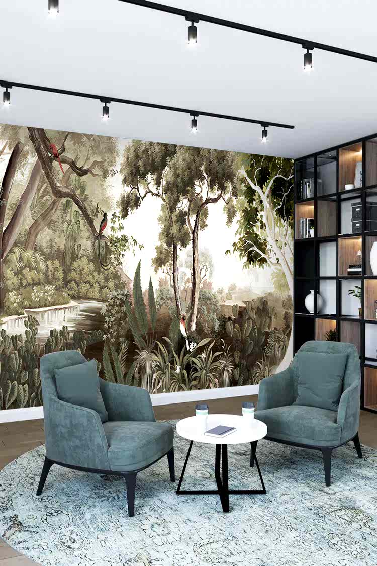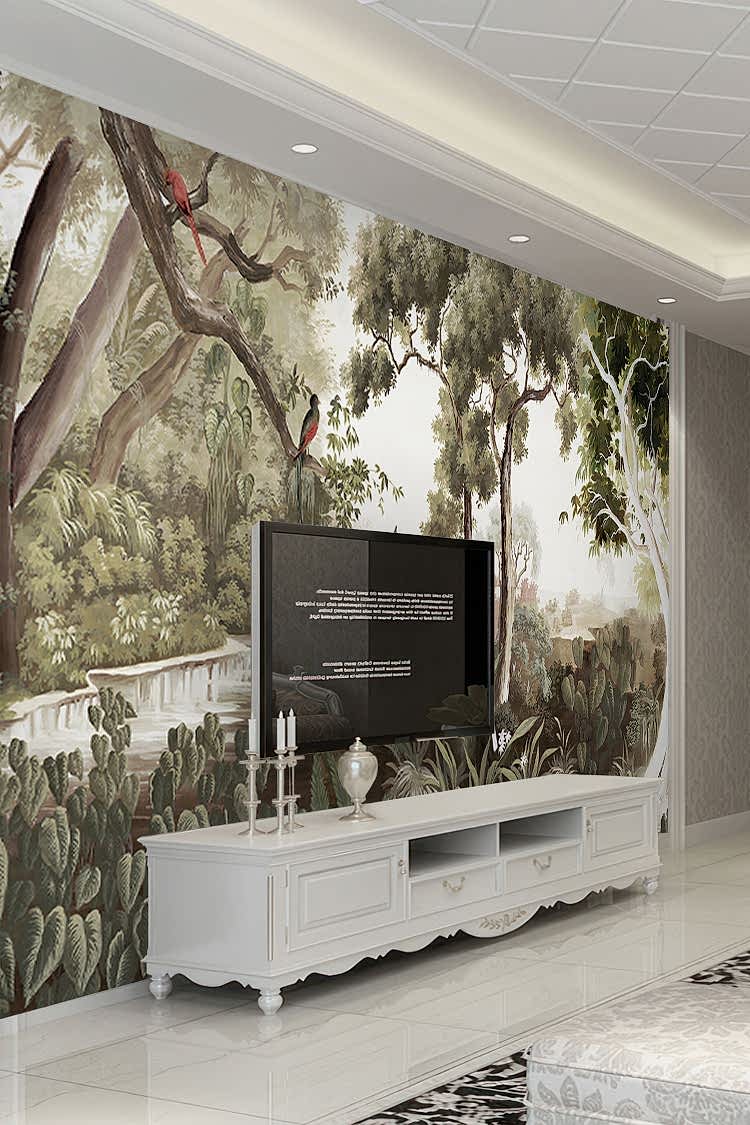 Canlı Tropikal Orman Manzaralı Duvar Kağıdı – Kuşlu Doğa Çizimi