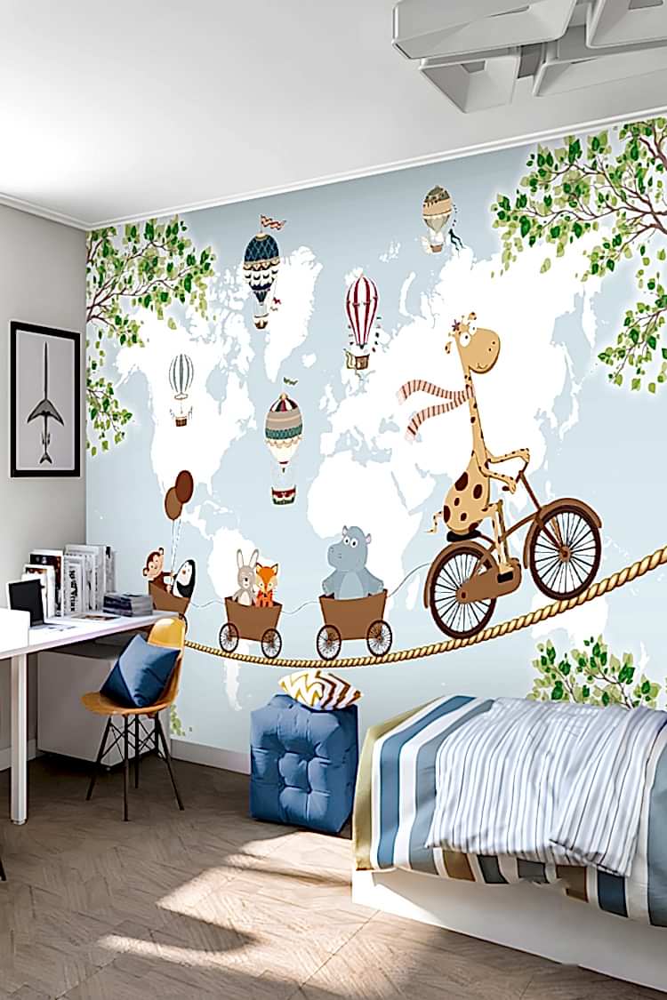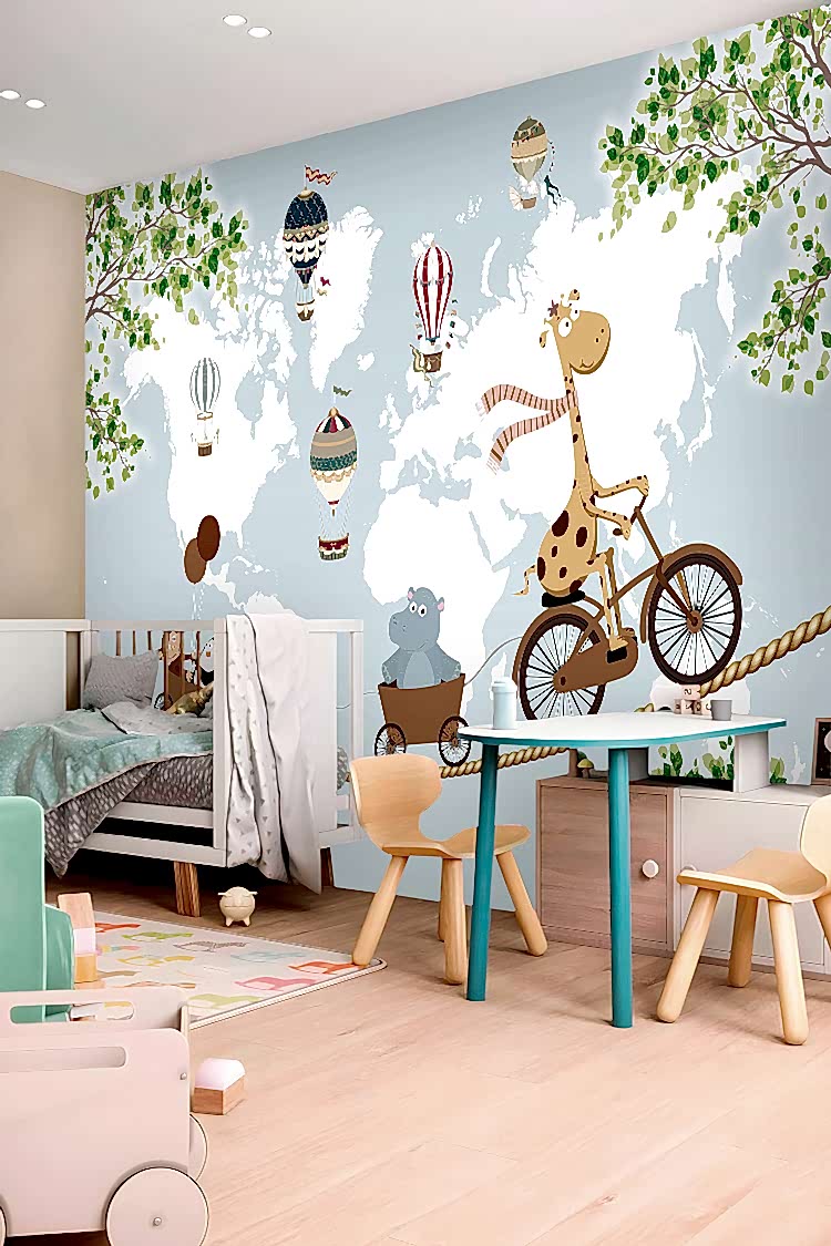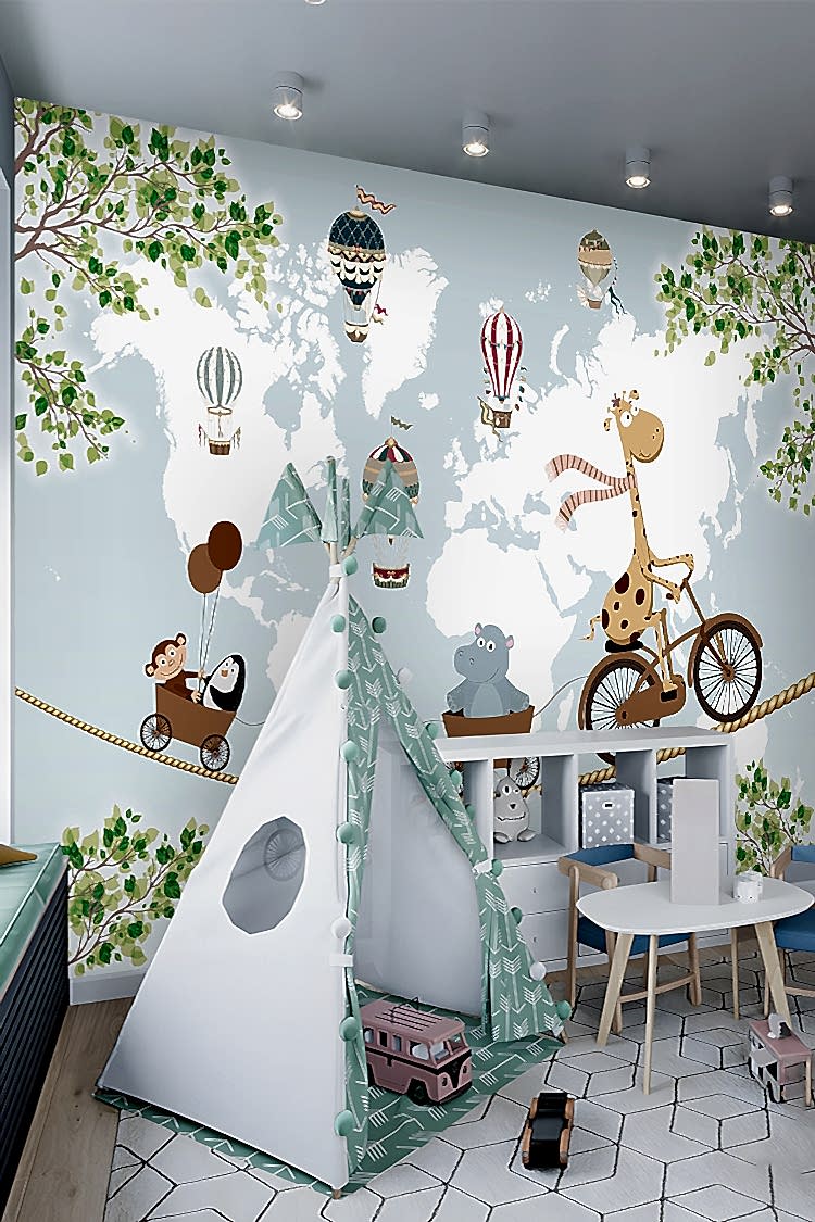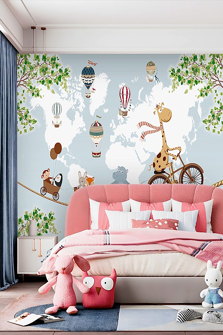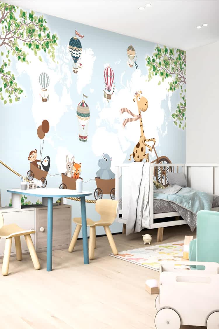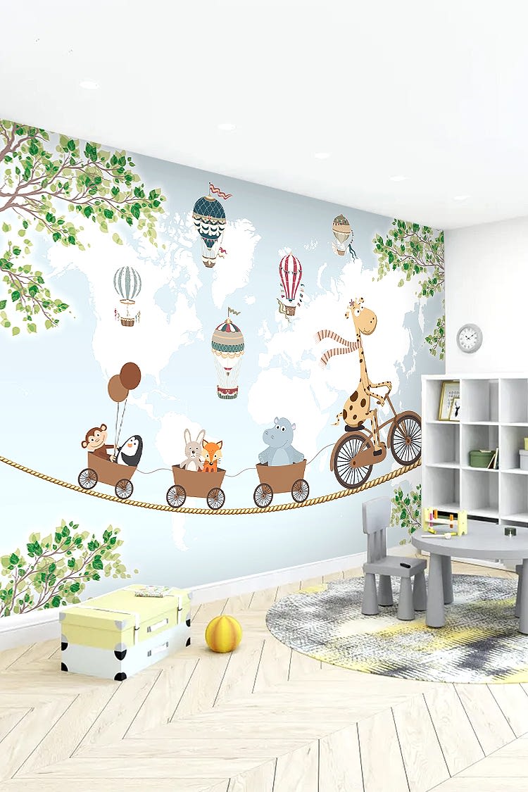 Dünya Haritası ve Uçan Balon Temalı Duvar Kağıdı