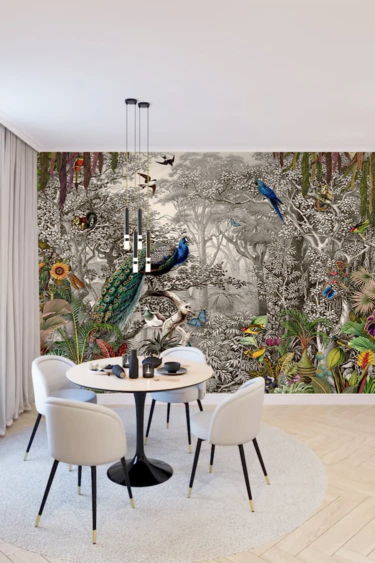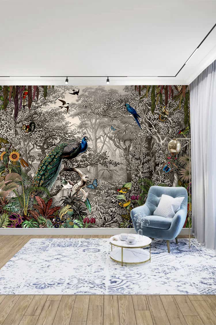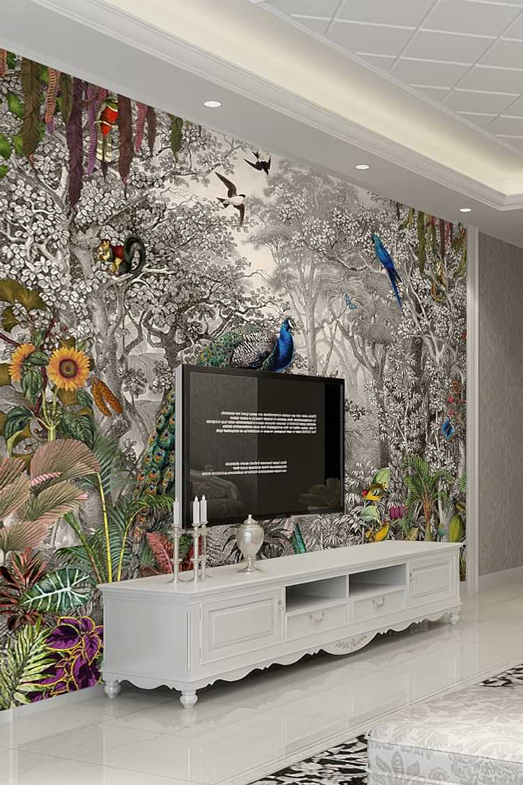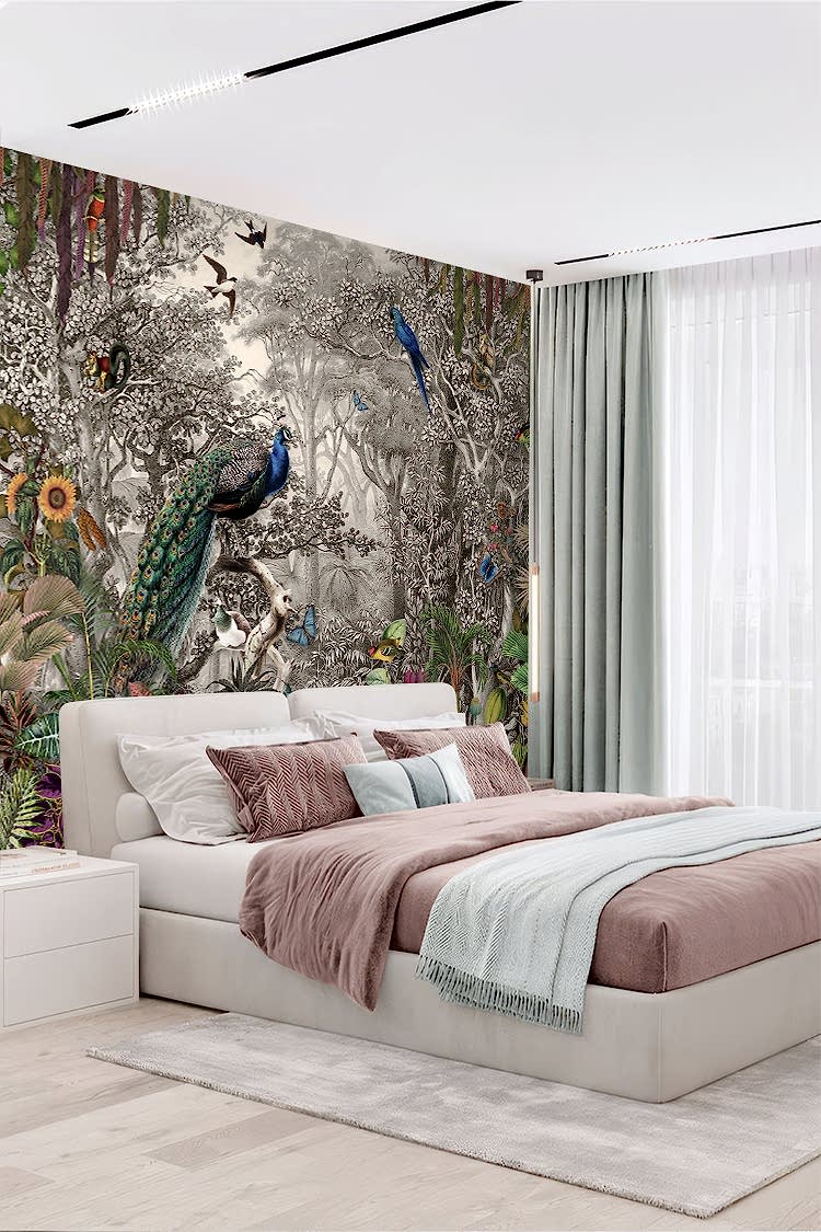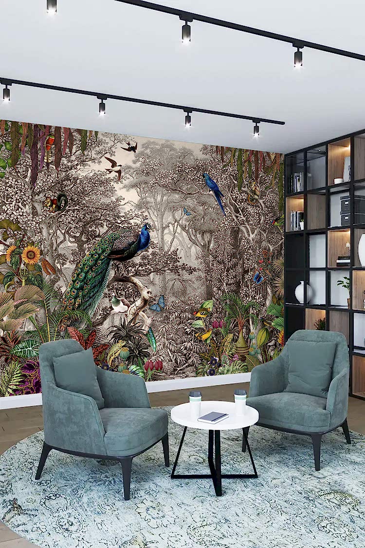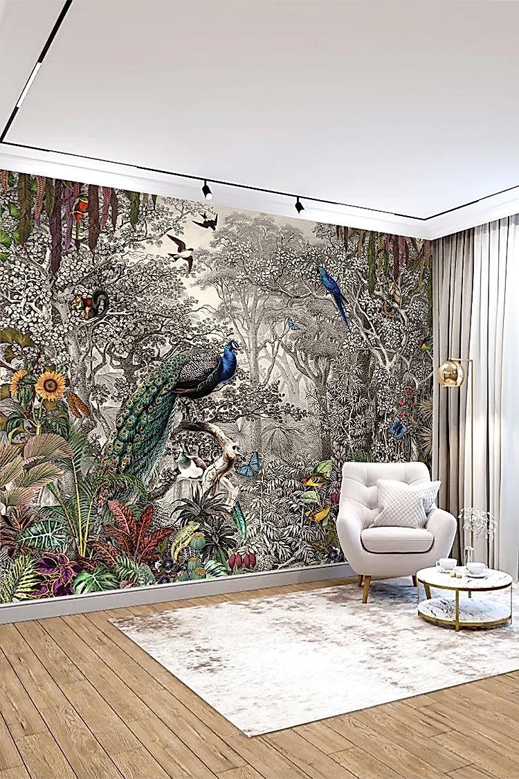 Orman Temalı Peacoklar ve Tropikal Bitkiler Duvar Kağıdı