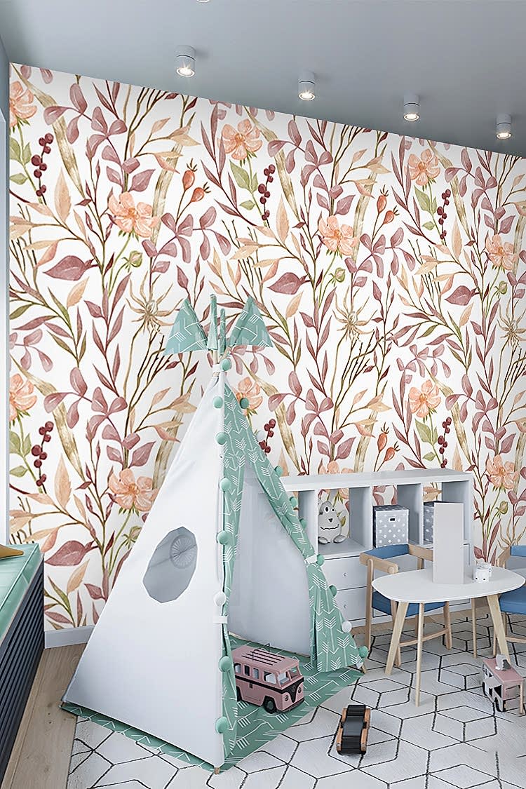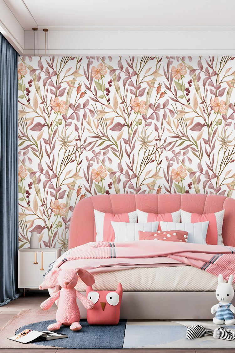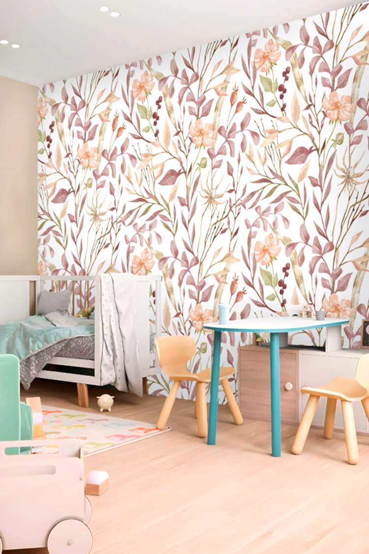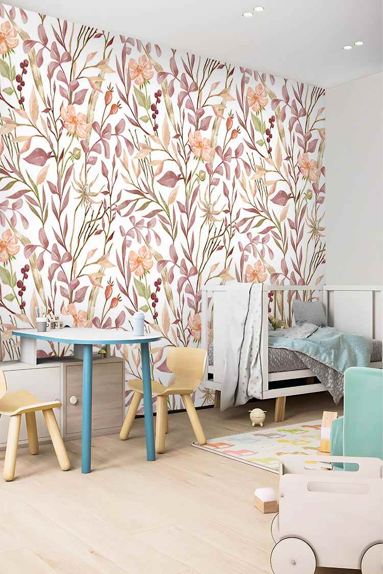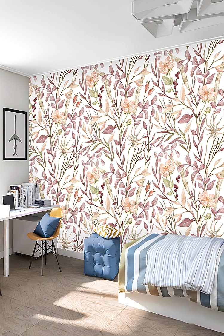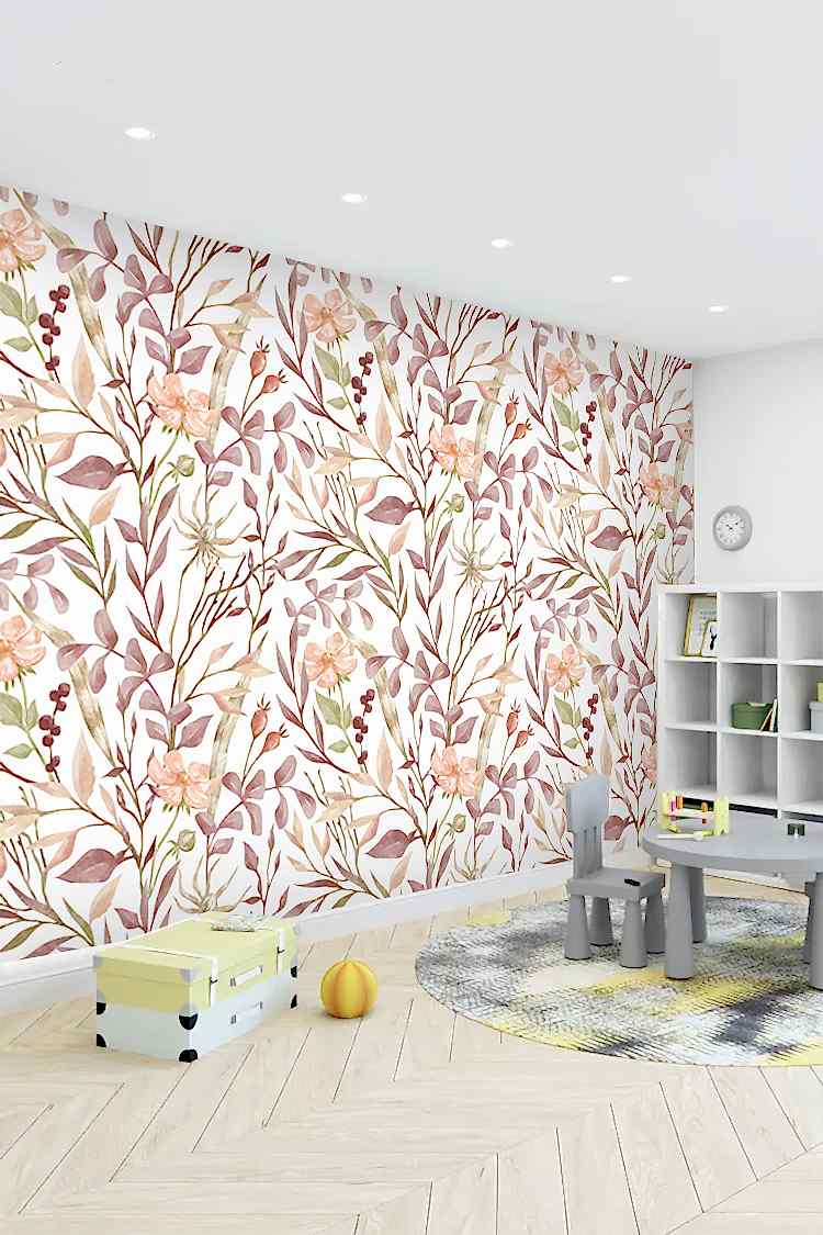 Pastel Botanik Çiçek Yaprak Desenli Duvar Kağıdı