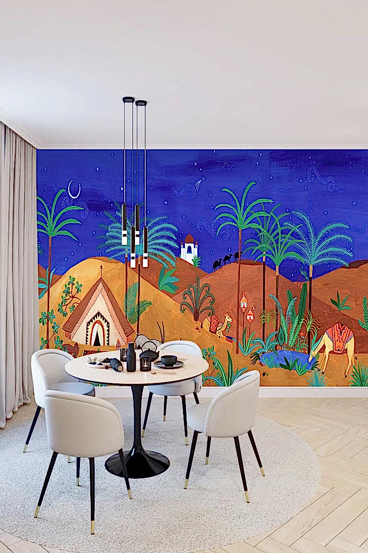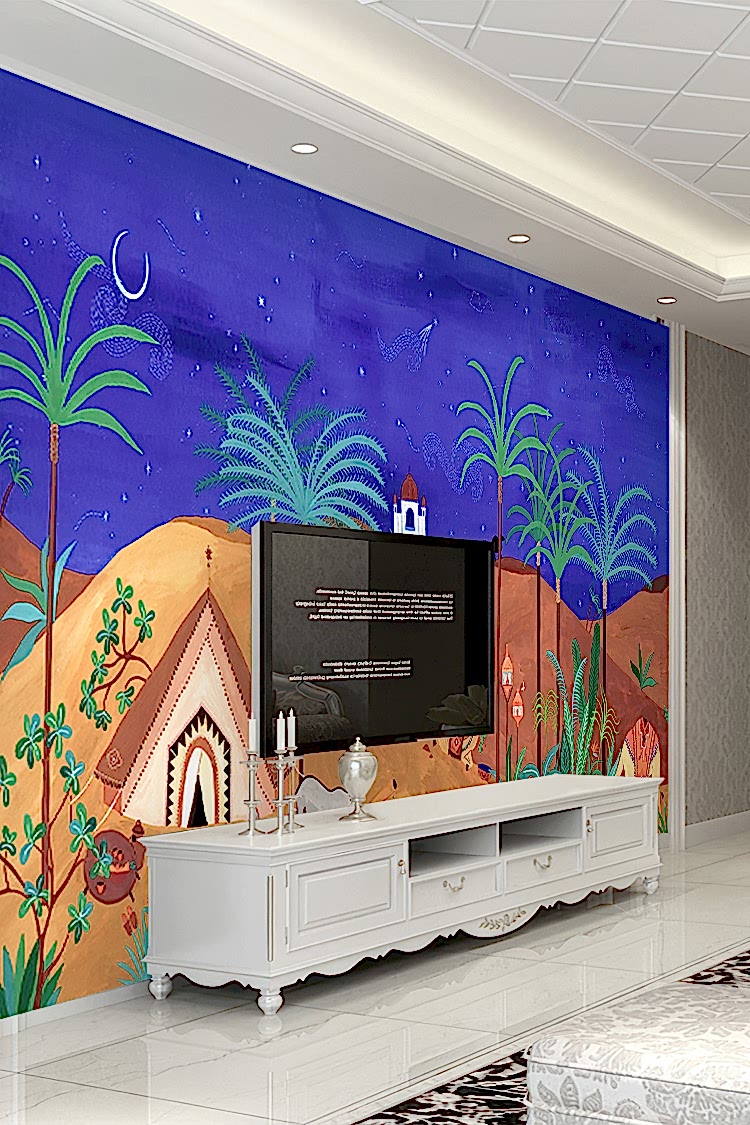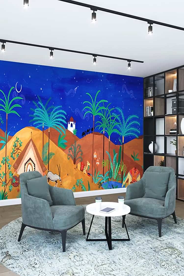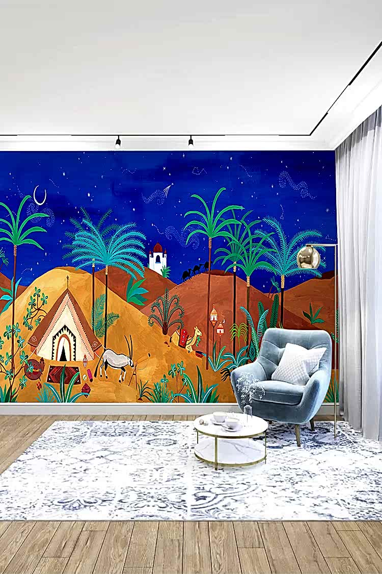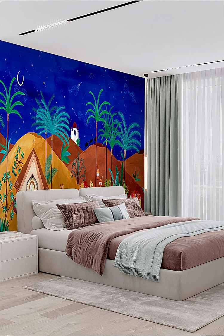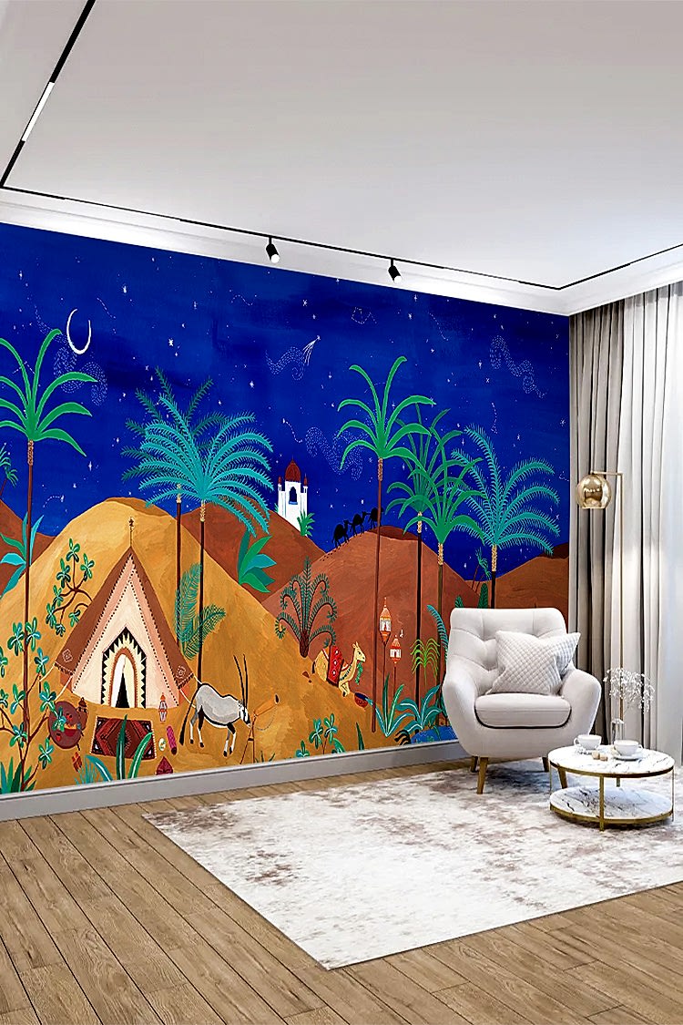Renkli Çöl Manzarası ve Palmiyeler Desenli Duvar Kağıdı