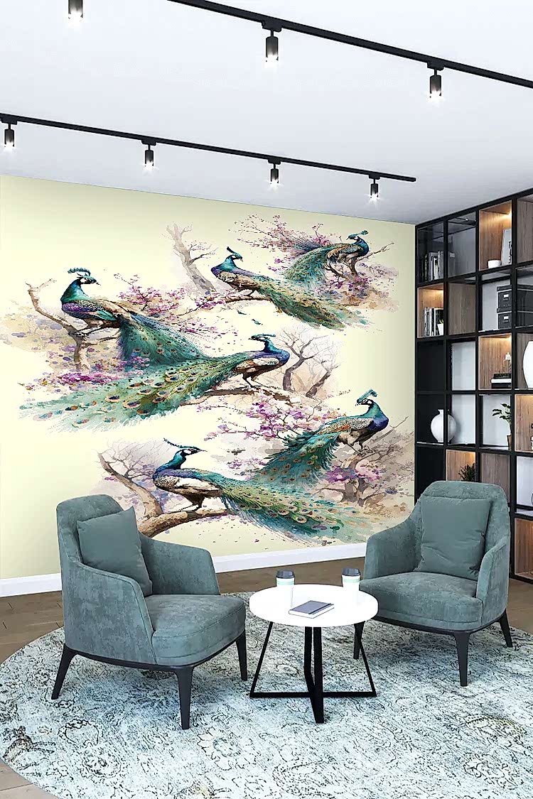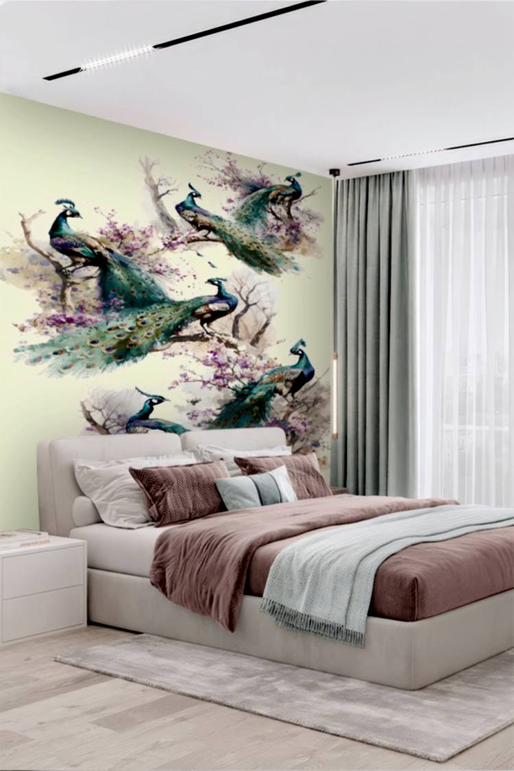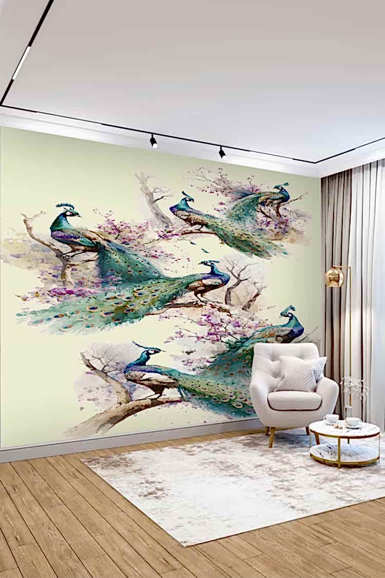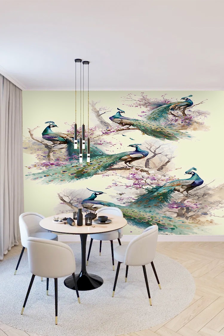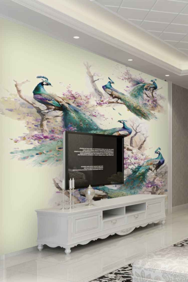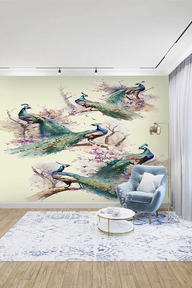Renkli Tavus Kuşları ve Çiçeklerle Duvar Kağıdı