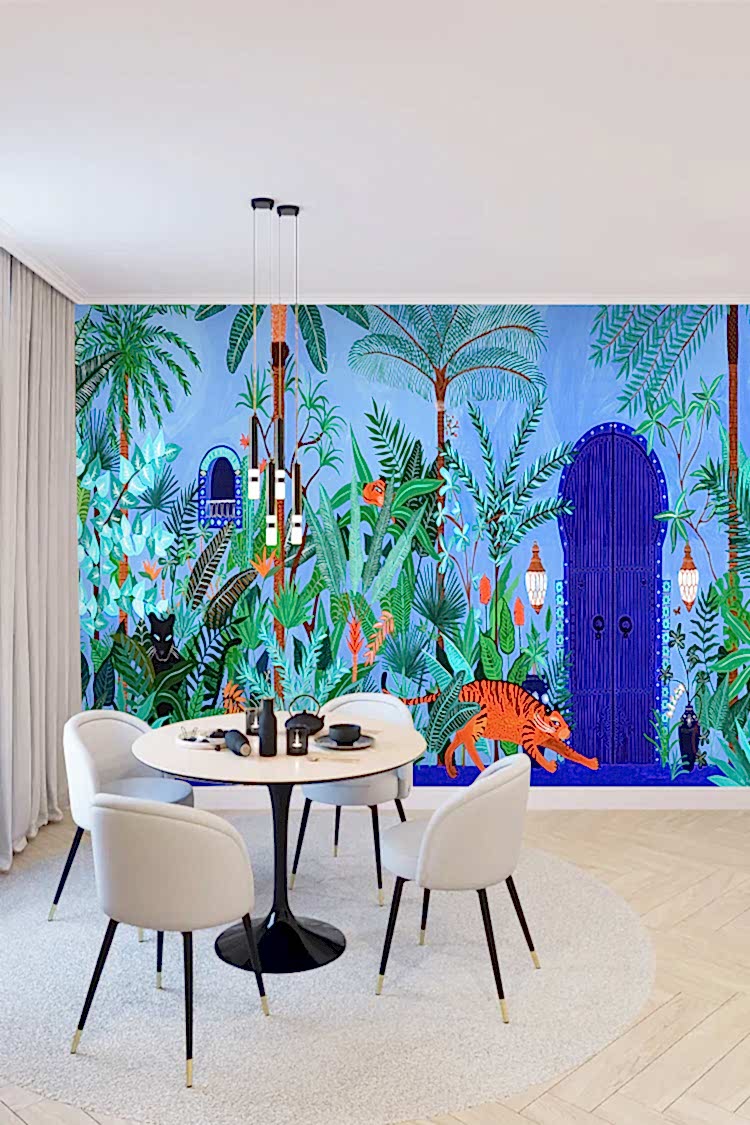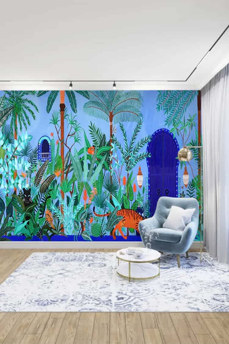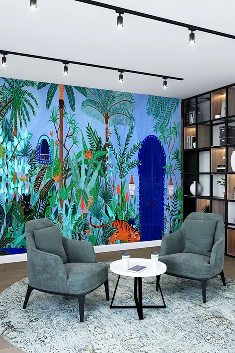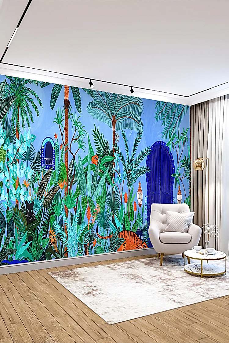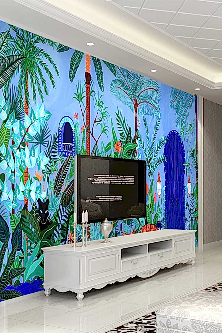 Renkli Tropikal Manzara ve Kaplan Desenli Duvar Kağıdı