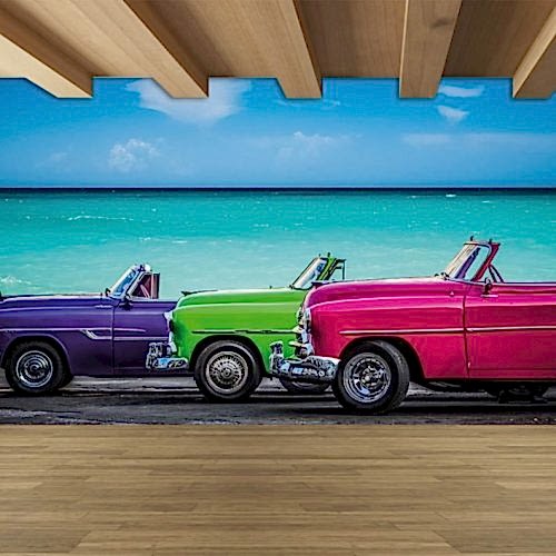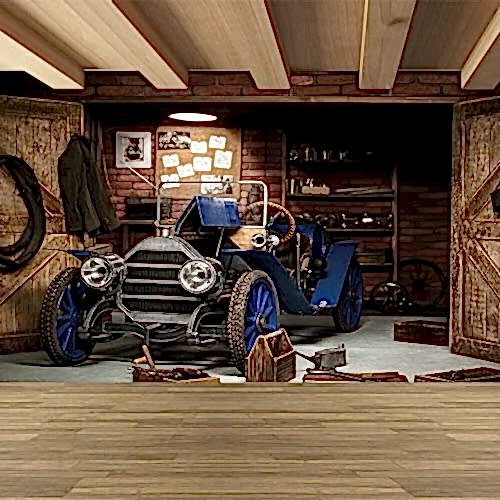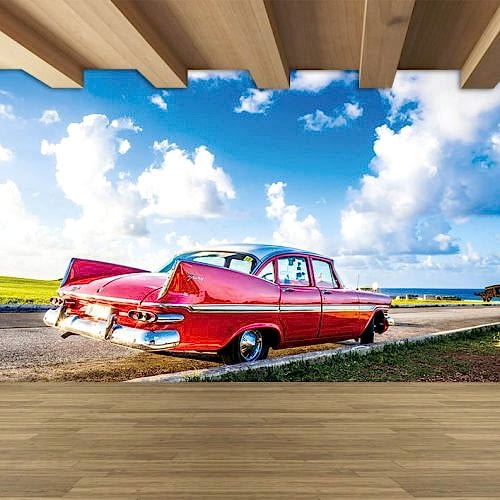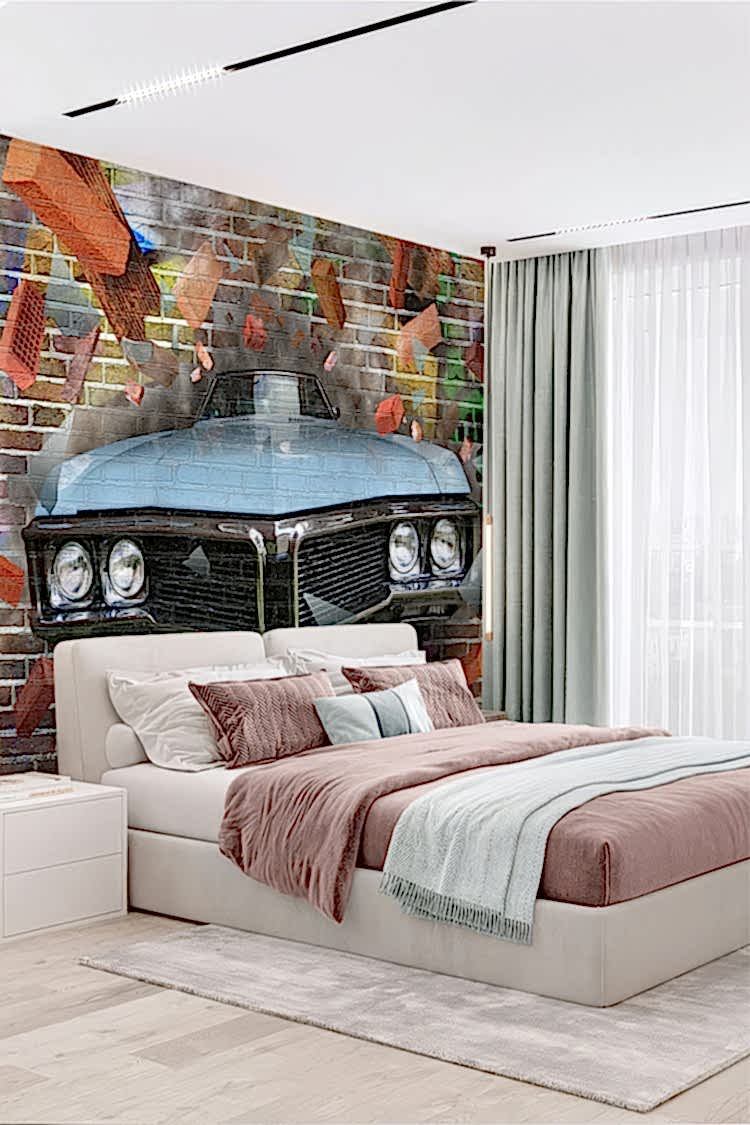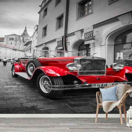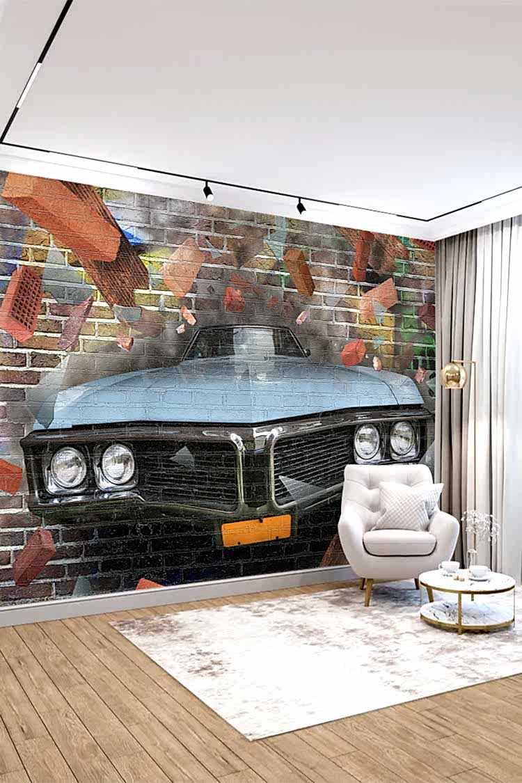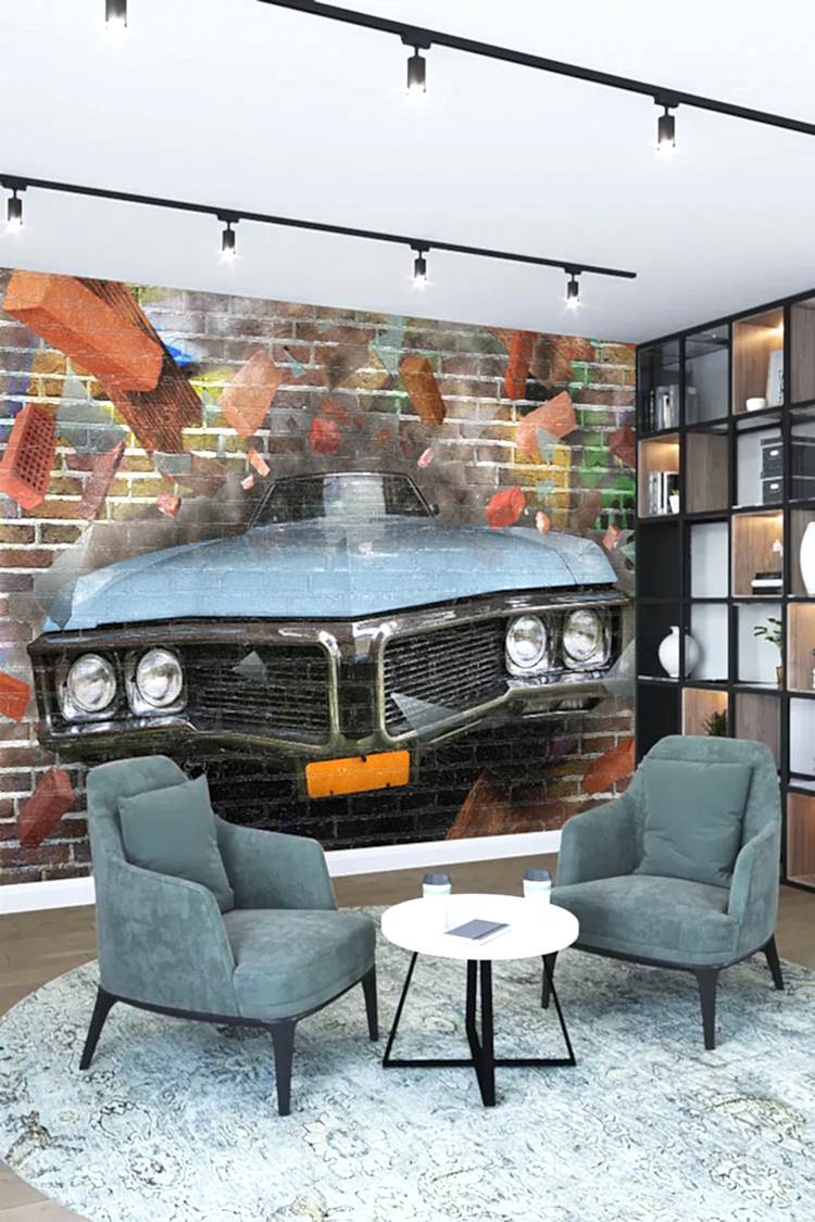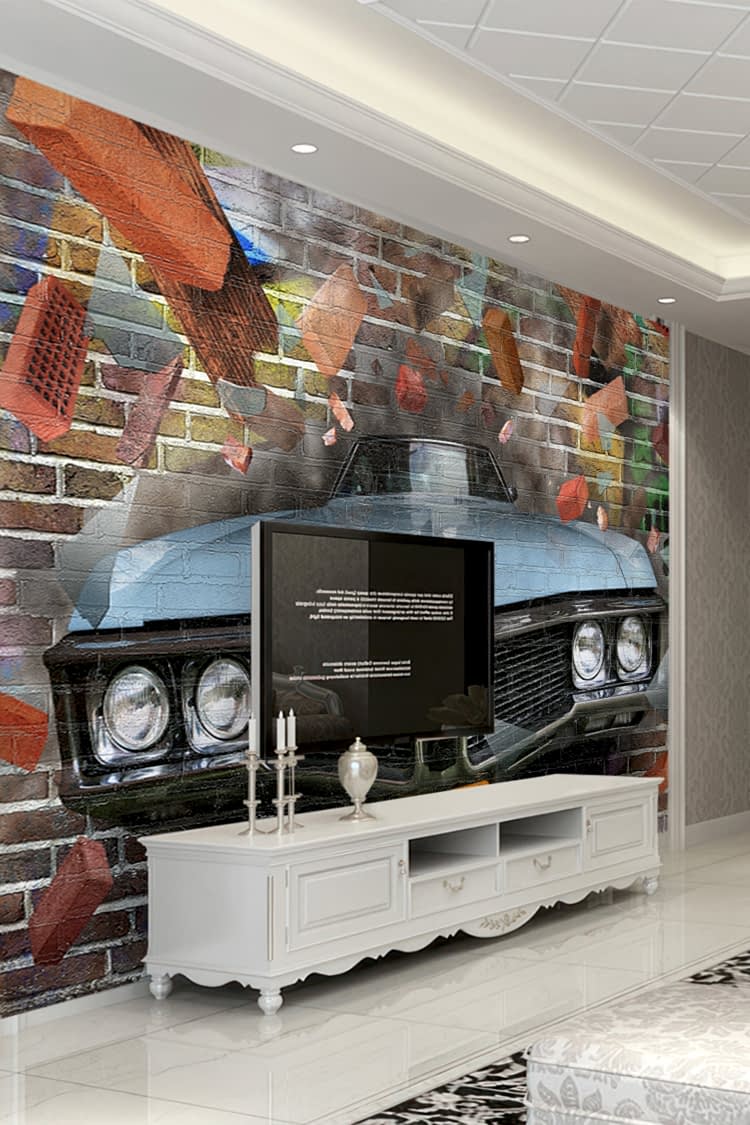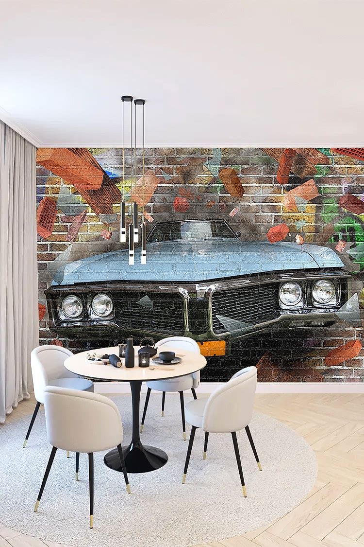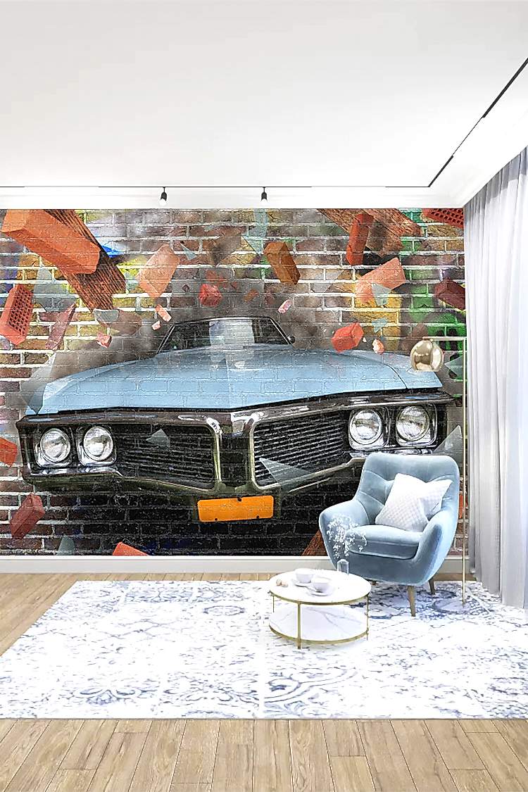 Retro Araba ve Tuğla Duvar Deseni ile Endüstriyel Duvar Kağıdı