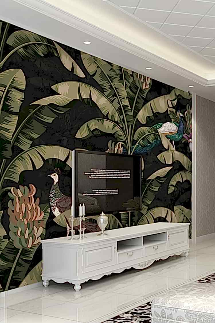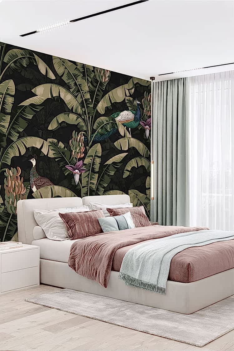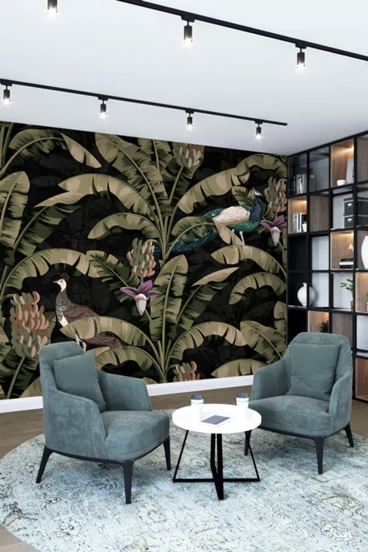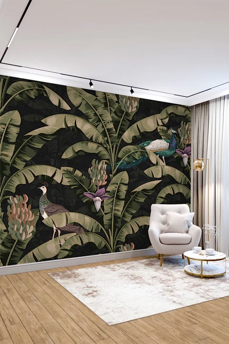 Tavuskuşları ve Tropikal Bitkilerle Koyu Tonlu Duvar Kağıdı