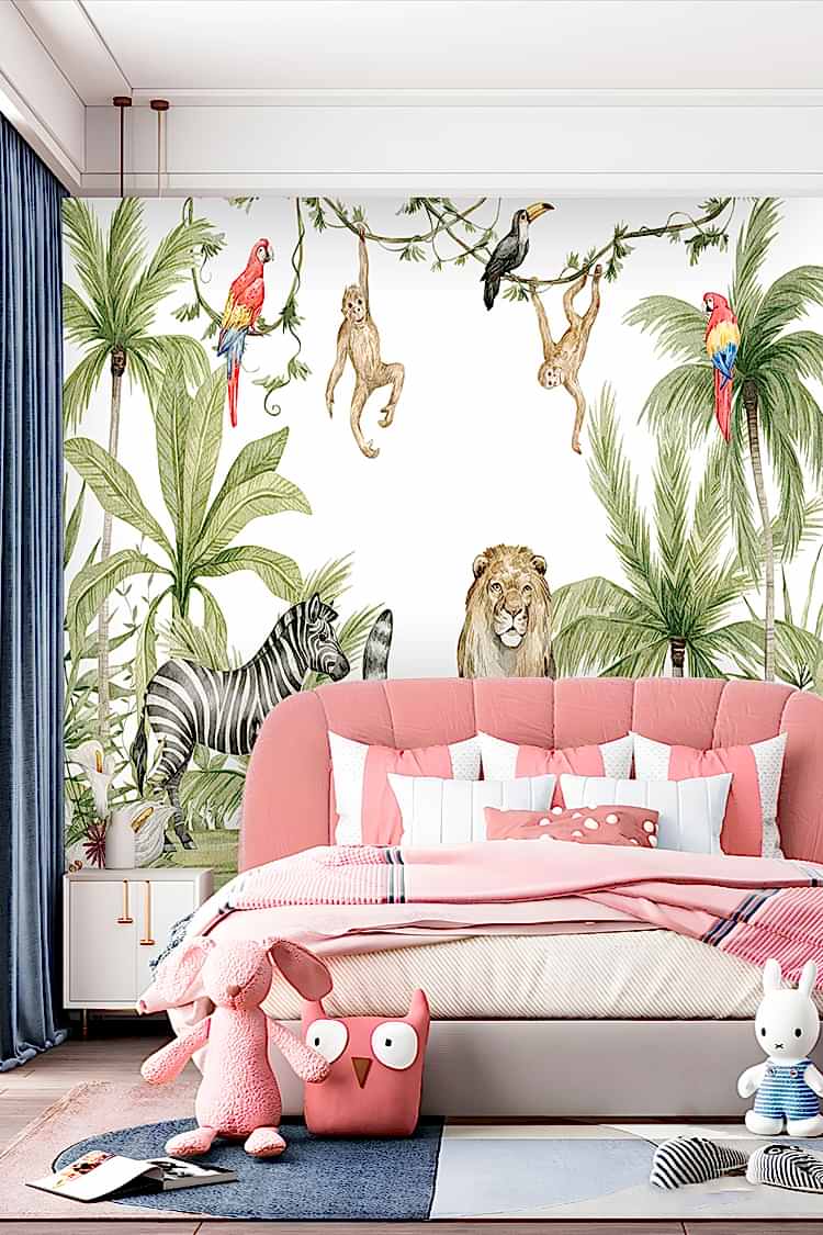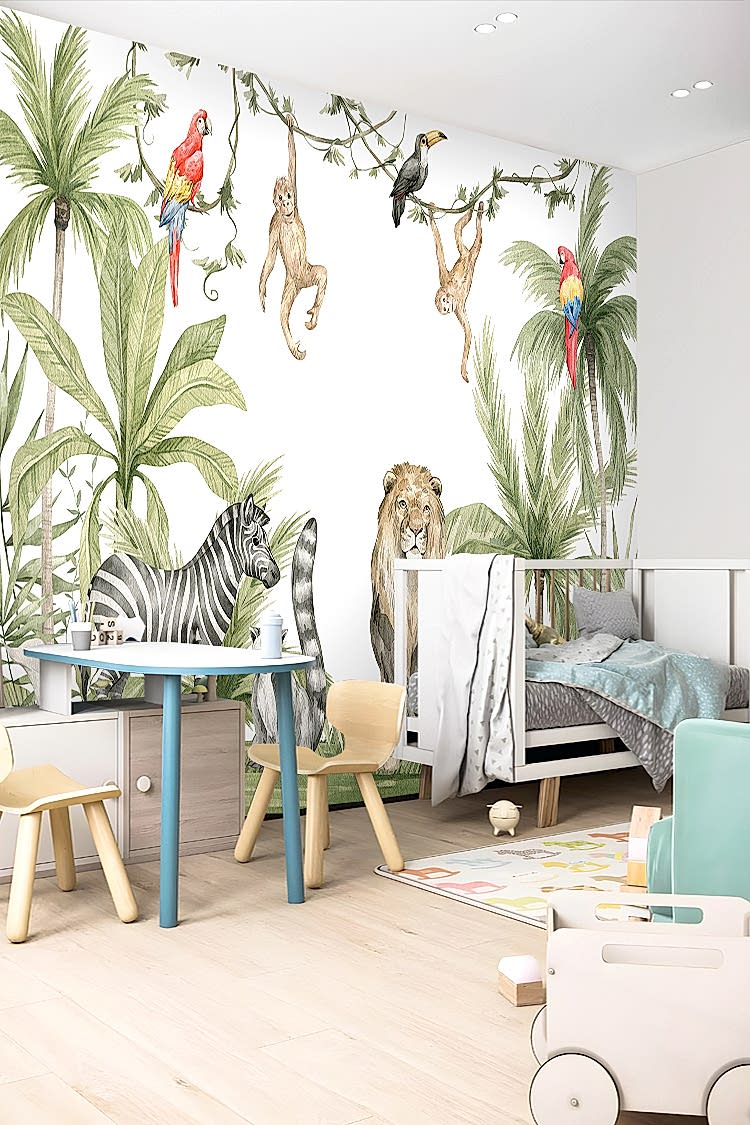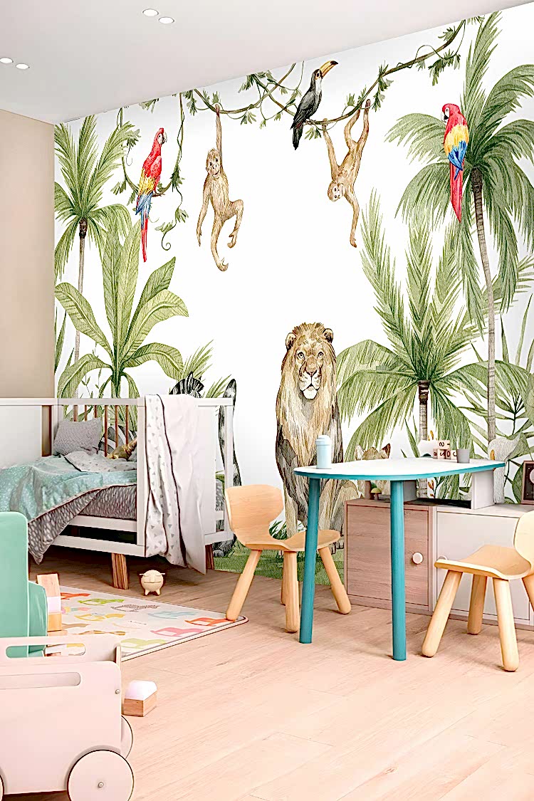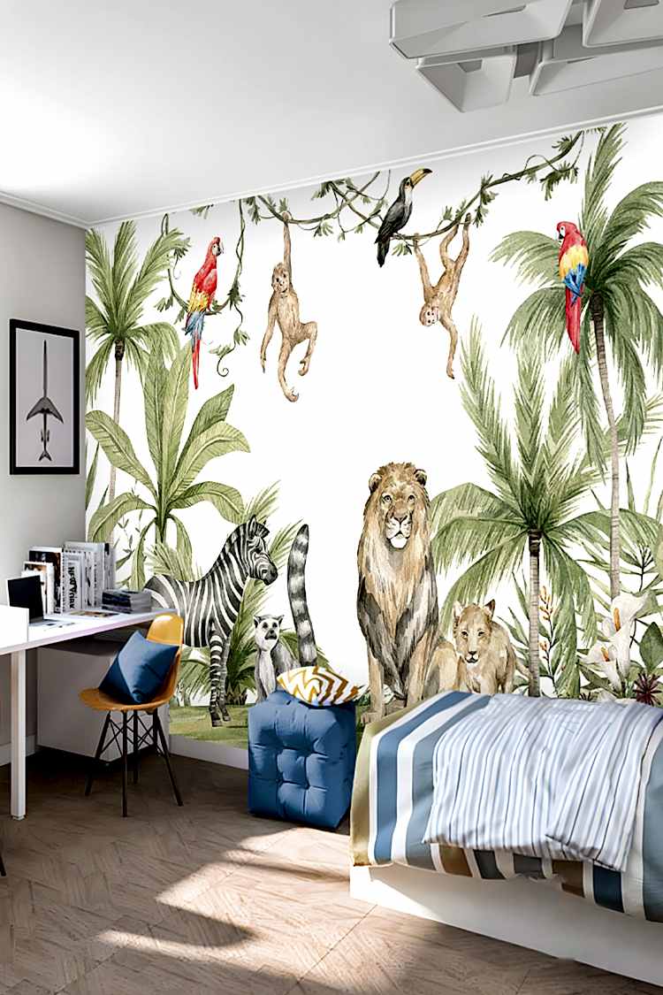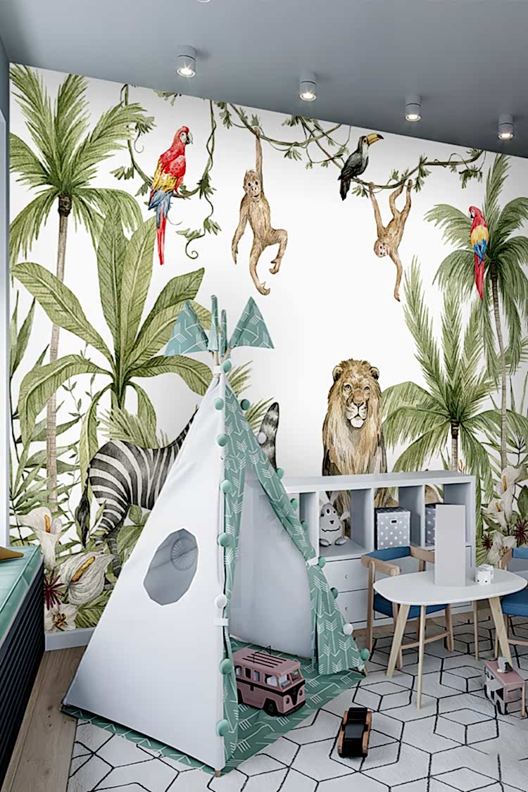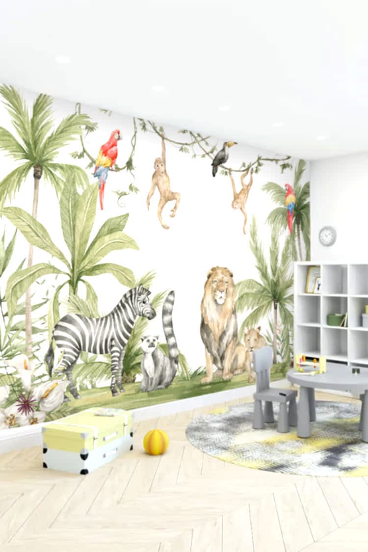 “Tropikal Hayvanlar ve Palmiye Ağaçlarıyla Duvar Kağıdı