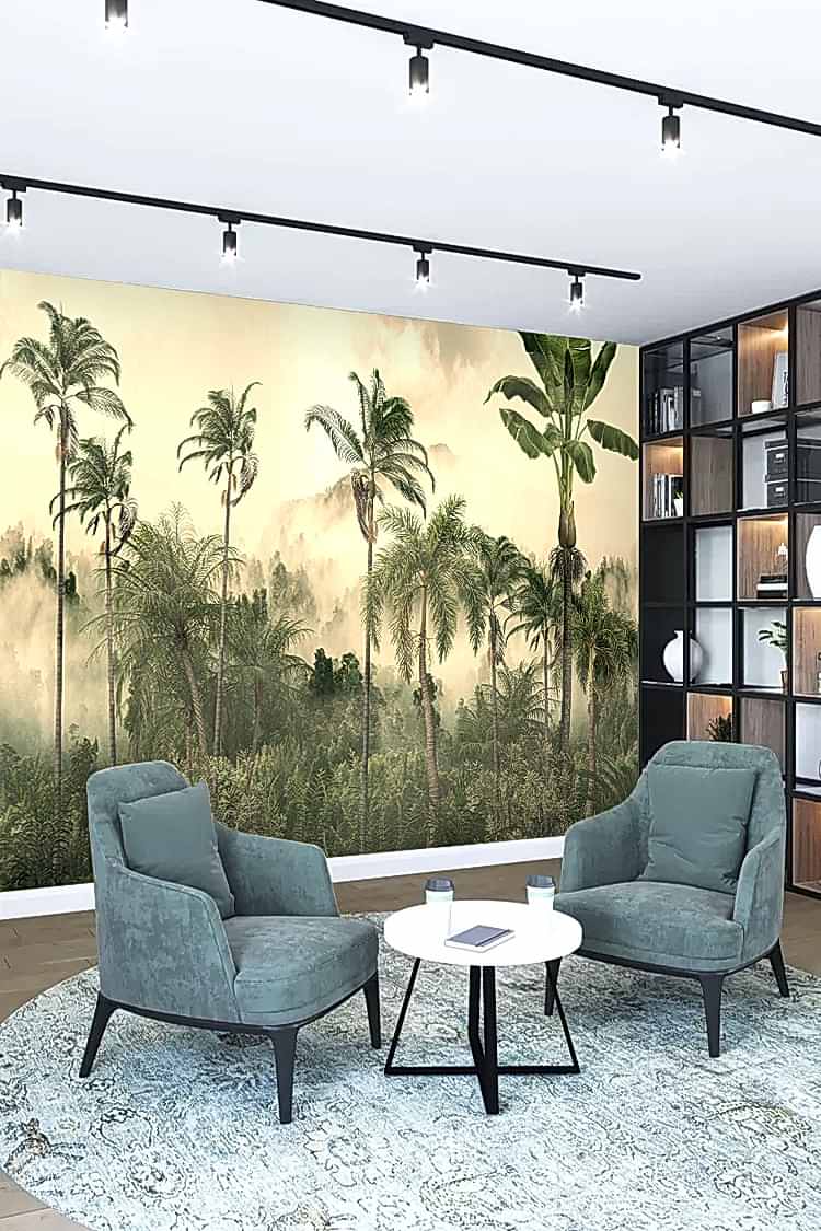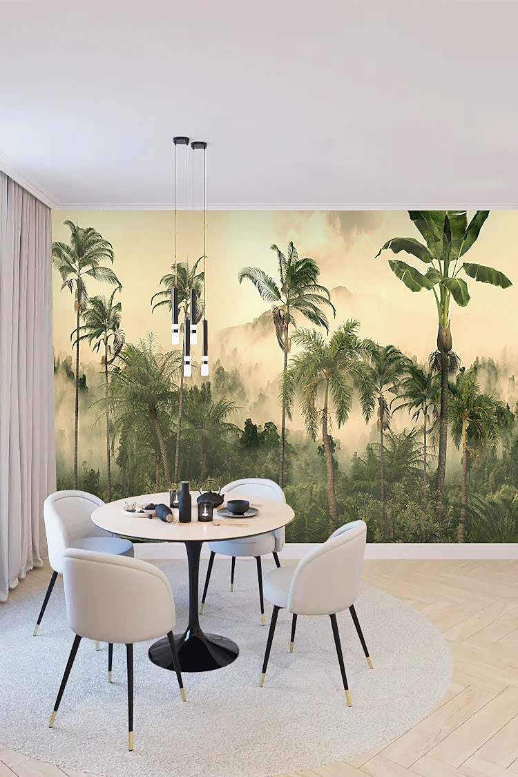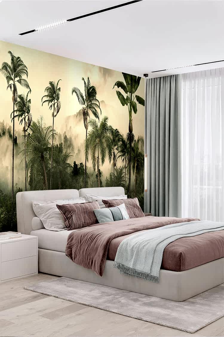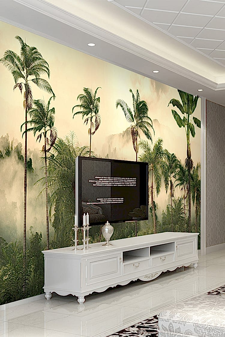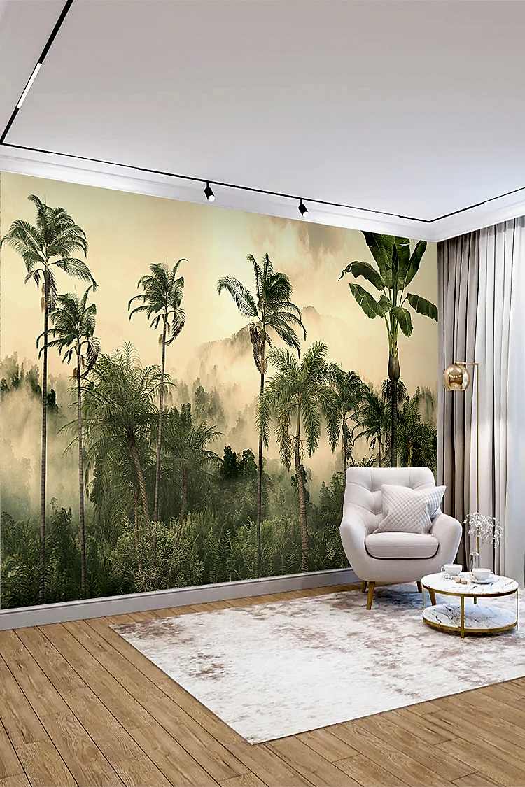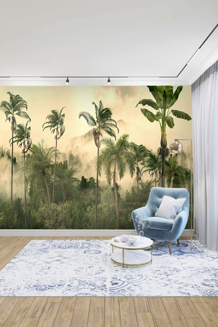 Tropikal Palmiyeler ve Sisli Doğa Manzaralı Duvar Kağıdı Tasarımı