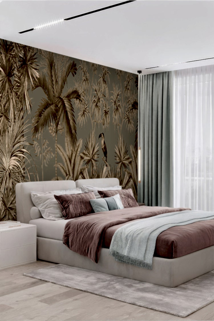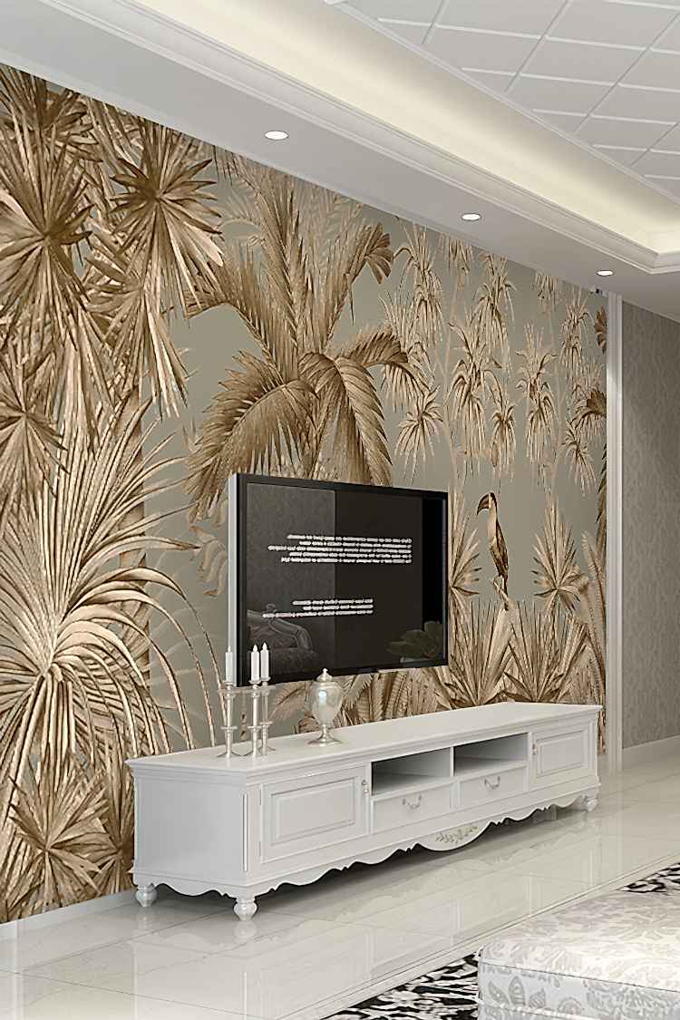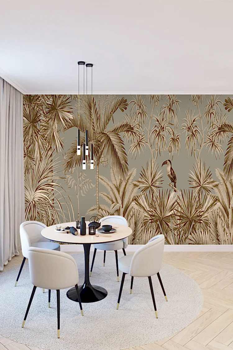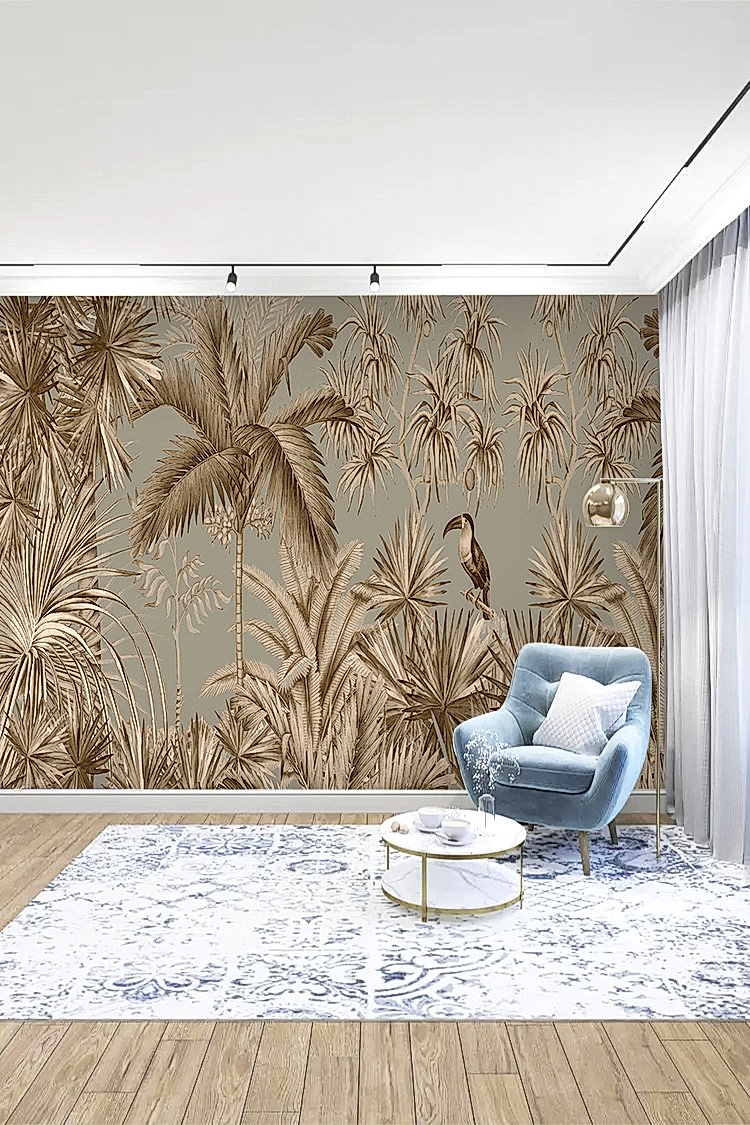Vintage Tropikal Palmiye ve Kuş Desenli Duvar Kağıdı