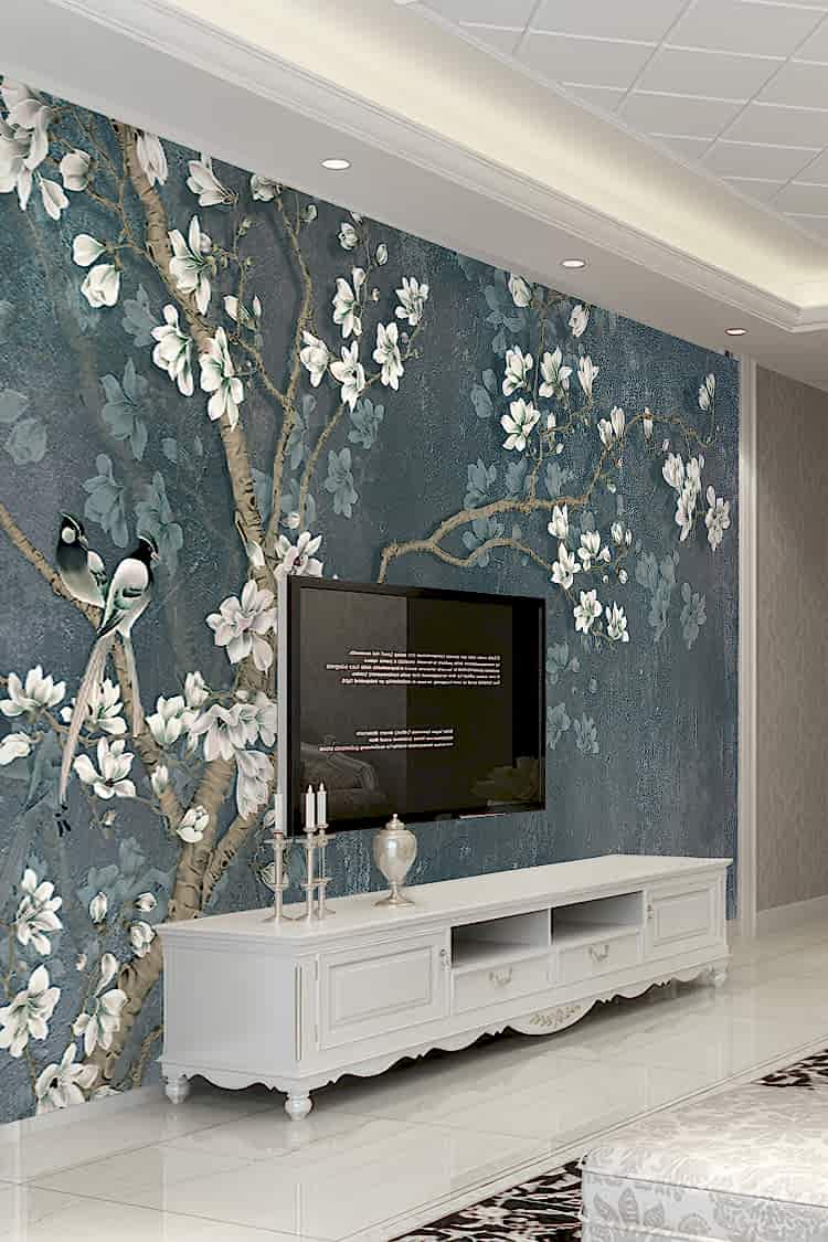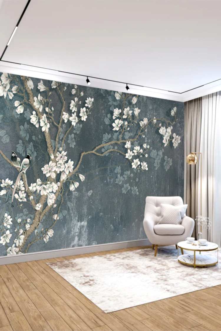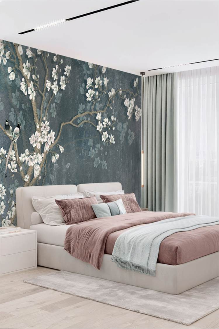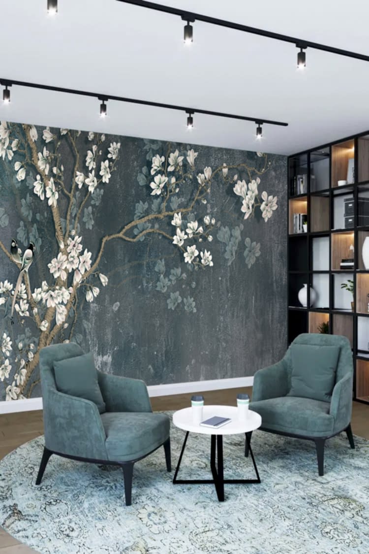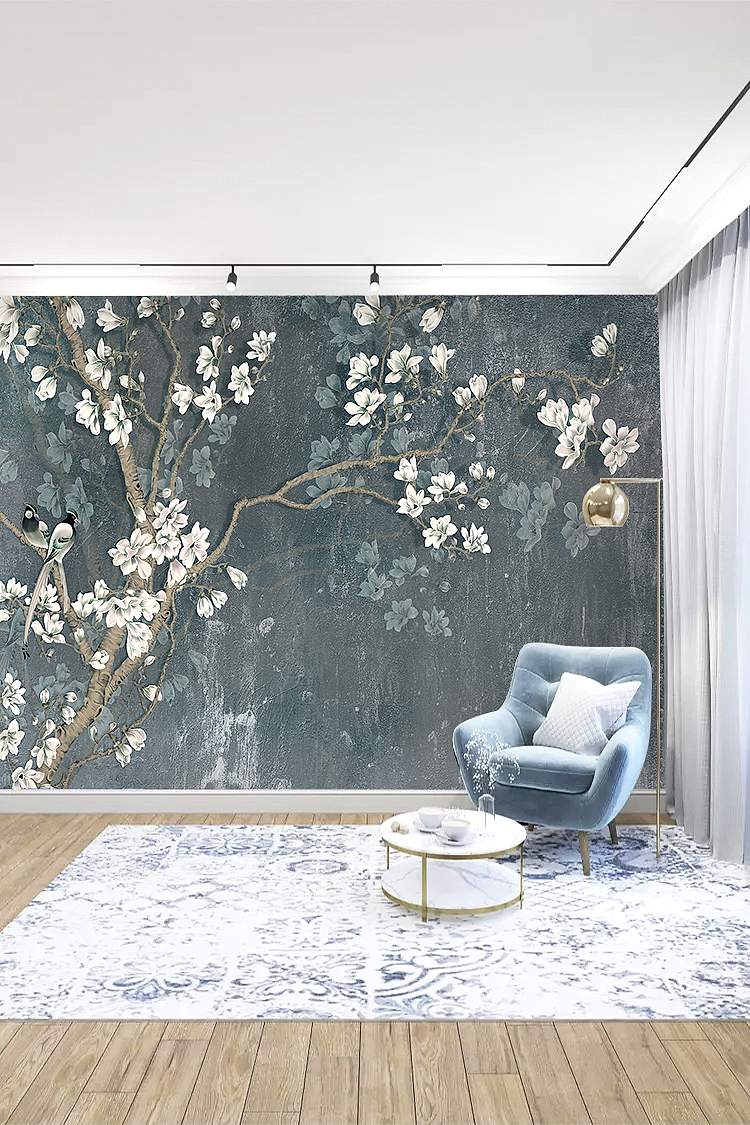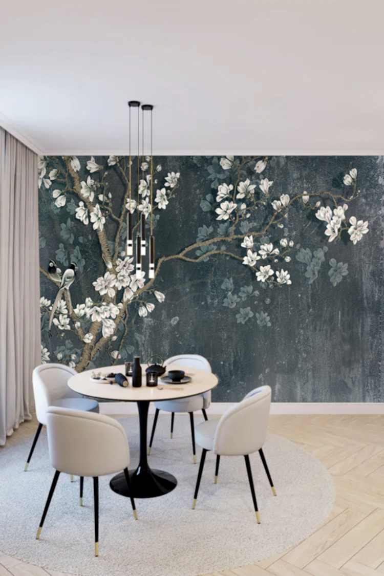 Zarif Beyaz Çiçekli Koyu Tonlu Duvar Kağıdı